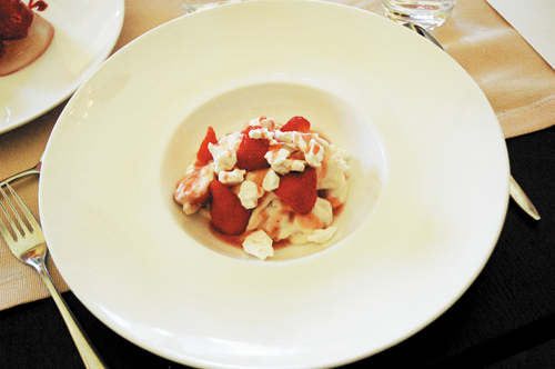 Переложить десерт в блюдо и украсить оставшейся нарезанной клубникой.