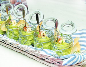 Предварительно замоченный горох варить в течение 35-40 минут в кипящей подсоленной воде. Подготовленные овощи – лук-порей и молодую морковь – нарезать произвольно, обжарить на оливковом масле с добавлением черного дробленого перца, соли, пасты базилика и отварного гороха. Через 3 минуты добавить зеленый горошек и измельчить все в блендере с добавлением овощного бульона. Добавить сливки и шпинат и еще раз взбить в пышную крем-массу; протереть через сито. Багет нарезать на порционные куски и подсушить на гриле. Ветчину тонко нарезать и также подсушить до состояния чипса. При подаче выложить из кондитерского мешка гороховый крем в подготовленную посуду. Декорировать кнелькой из сыра Мирабо, чипсом из ветчины, Кресс-салатом. Рядом на сервировочное блюдо выложить готовый багет.