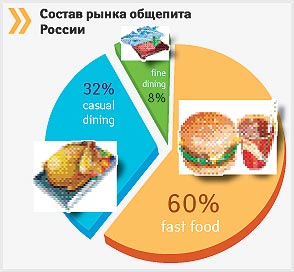 Состав рынка общественного питания России с прошлого года не претерпел изменений и остался тем же: на первом месте по-прежнему заведения сегмента fast food — они занимают более 50% рынка, за ним следуют casual и fine dining (см. диаграмму «Состав рынка общепита России»).