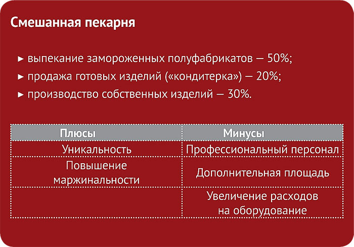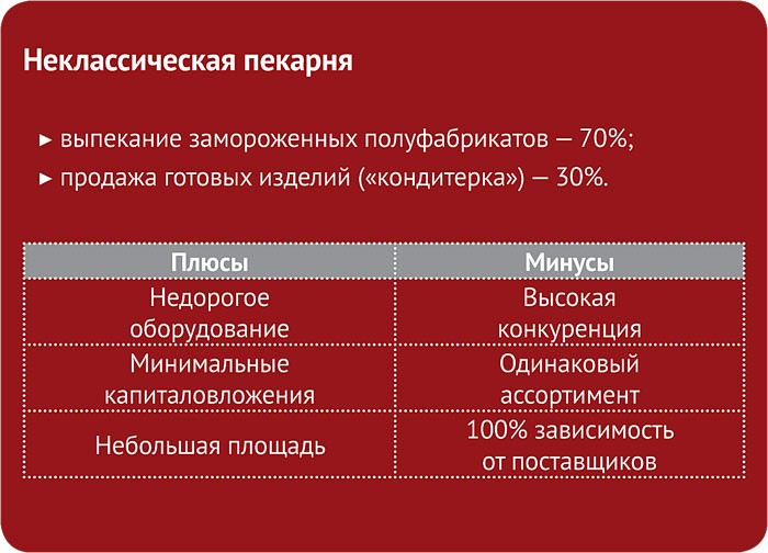 Неклассическая пекарня работает в основном на замороженных полуфабрикатах, хотя и может предлагать готовые кондитерские изделия. Среди главных преимуществ такой пекарни для бизнесмена — недорогое оборудование, небольшая площадь и, соответственно, минимальные капиталовложения. Поэтому подобных предприятий на рынке очень много — и именно в этом состоят их главные недостатки: высокая конкуренция и одинаковый ассортимент, потому что выбор поставщиков на самом деле невелик — всего пять-шесть заводов, выпускающих фактически одно и то же, а значит, и стопроцентная зависимость от поставщиков.