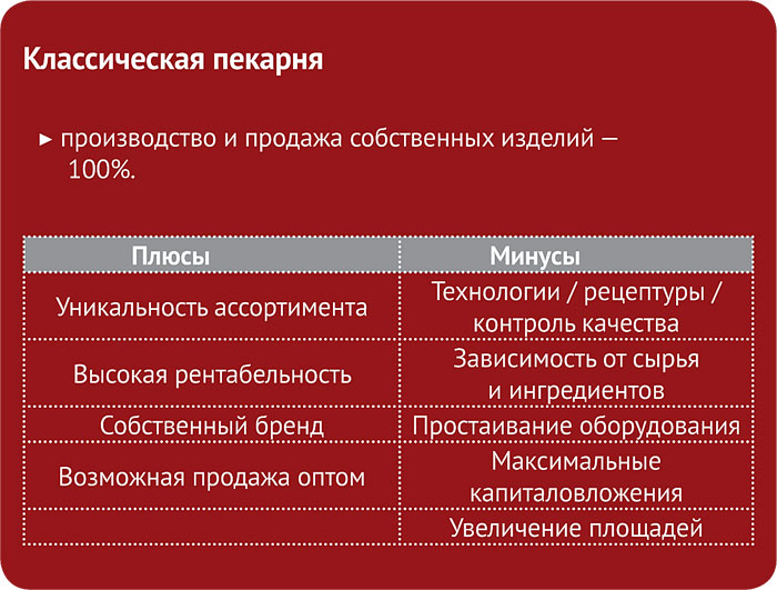 Но в случае решения открыть пекарню с полностью собственным производством предприниматель сразу же получает и множество плюсов — уникальность продукции, достаточно большую рентабельность, собственный бренд и, конечно же, возможность продавать свою продукцию оптом, чтобы оборудование не простаивало.