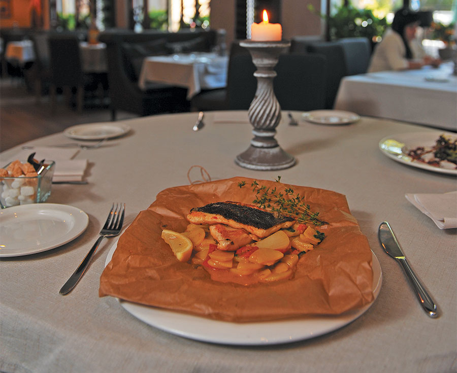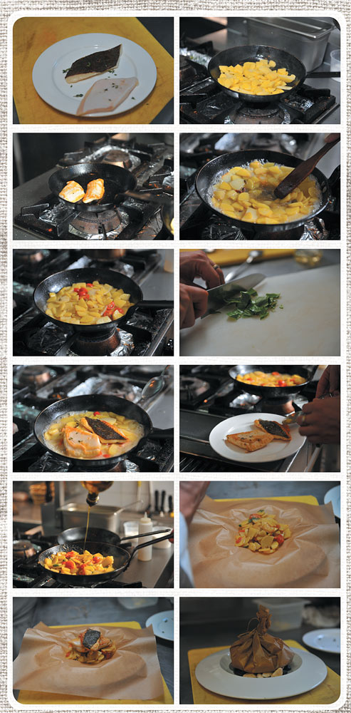 Тарелку накрыть листом пергамента. На пергамент выложить картофель с соусом на основе рыбного бульона, сверху него — филе камбалы. Завернуть пергамент в виде мешочка, завязав его бечёвкой.