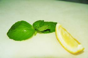 9. Украсить блюдо парой листиков свежего базилика и долькой лимона. Немного поперчить.