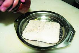 4. Филе палтуса посолить, поперчить, обжарить с двух сторон на раскаленной сковороде на растительном масле со свежей веточкой розмарина и долькой чеснока.