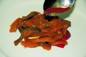 8. По краям тарелки, вокруг перца, полить апельсиновым соусом.