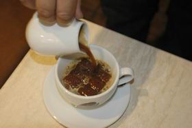 4. Влить свежеприготовленный эспрессо из смеси трех арабик из Эфиопии, Колумбии и Коста-Рики (85%) и робусты. Напиток готовится на профессиональной кофе-машине эспрессо-методом на базе кофе-американо: это эспрессо с большим добавлением воды. Он получается менее крепким, с хорошими крема орехового цвета. Однако кофе можно приготовить и другим любым доступным способом, главное – чтобы зерно было свежей обжарки, а значит – ароматным, что крайне важно для вкуса.