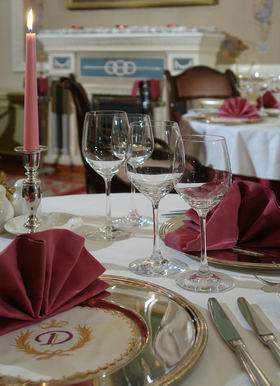 Другая концепция ресторана русской кухни — это русский ампир и всяческое ему подражание. Здесь предметы старины нивелируются, на первый план выходят элементы классического декора, а в посуде предпочтение отдается белому фарфору с изящной орнаментальной полосой, наиболее популярна из которых красная. Для таких ресторанов можно предложить такие серии фарфора Стилайт как Ambassador, Marina Red, а из приборов рекомендуются либо богатые декором приборы линеек Kreuzeband и Michelangelo от немецкого завода-производителя Hepp, либо опять же классические, более простого декора линейки Eme — Royal и Impero.