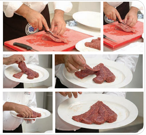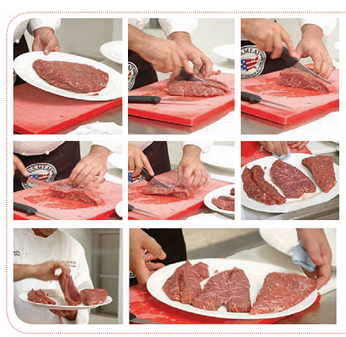 Так как отруб треугольной формы, важно видеть, что волокна идут вниз, и резать его поперек волокон. Я обычно разрезаю его на кусочки примерно по 250 г и жарю на гриле. Поскольку отруб треугольный, всегда будет оставаться кусочек, который нельзя использовать.