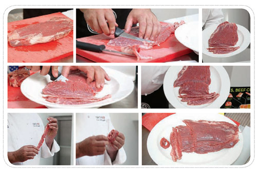 Тонкие кусочки этого отруба очень любят использовать в китайских ресторанах, но для стейк-хаусов они тоже хороши: мы делаем ролл, где мясо – оболочка для морепродуктов. Сверху опаливаем огнем (по типу приготовления крем-брюле), цвет продукта меняется, а внутри он остается сырым. Это наше специальное предложение!
