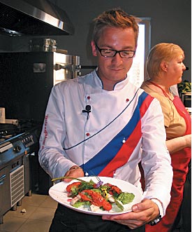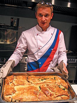 — Я не делал практически никаких заготовок, чтобы показать весь процесс приготовления, — подчеркивает Николай, — и решил представить на мастер-классе простые, но очень интересные блюда нашей кухни. Сегодня в большой моде морепродукты, и «Салад с раками воронежскими» (именно так, по-старинному, — «салад», а не «салат») мне показался хорошей альтернативой блюдам с креветками: это для начала трапезы. Основное блюдо — «Щука ярославская с горчичным картофелем»: к этой рыбе у многих поваров неоднозначное отношение — мол, щука пахнет тиной и прочее. А мы ее представим с необычным дополнением — редисом в свекольном соку. Наконец, «на сладкое» — «Кулебяка на четыре угла». Это русский закрытый пирог с четырьмя начинками. Но они расположены не так, как многие сразу же представят, — по четырем углам пирога, а по две начинки друг на друге: две на одной половине пирога, две — на другой. «Четыре угла» получаются на продольном срезе — именно так пекли этот пирог во времена наших прабабушек и прадедушек.