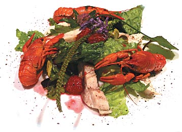 На тарелку выложить листья салата. Динамично разложить раков, помидоры черри, мясо цыплят, малину. Полить малиновым вареньем. Поставить голову рака на украшение. Украсить салад луком скорода, кресс-салатом и цветами клевера.