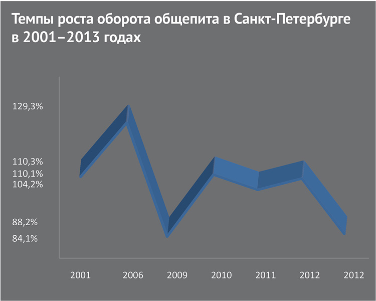 Падение рынка общепита СЗФО на 4,6% само по себе очень существенное, но заставить задуматься многих рестораторов нашего округа должно другое. А именно то, что, например, калининградский регион показал рост на 9%, Карелия — на 7%, Ненецкий автономный округ — на 21%. А Петербург — минус почти 12%: 11,8% — то есть, собственно, всего 88,2% от оборота 2012 года.