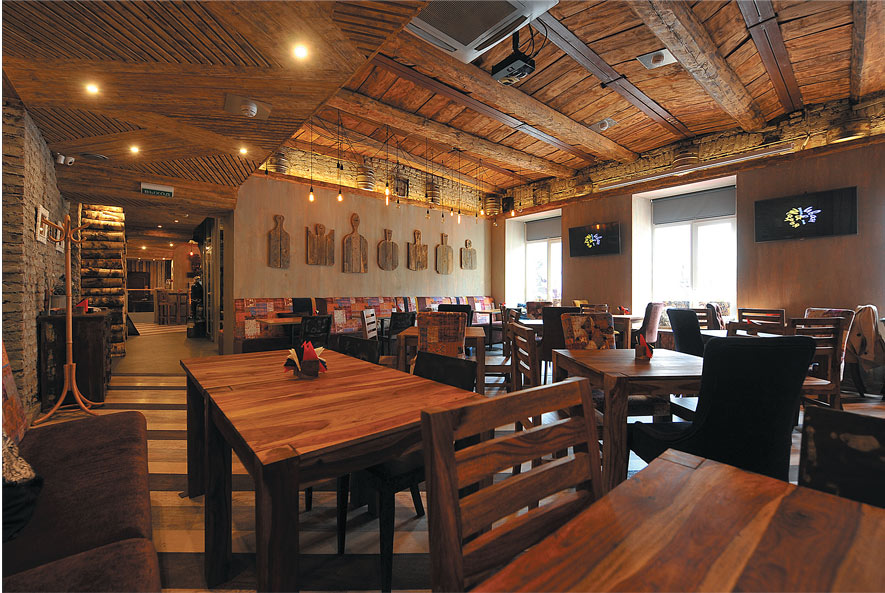 При въезде в помещение перепланировку делать не стали, оставив четыре рабочих зала и кухню. Но сняли гипрок со стен, открыв кирпичную кладку, и с потолка, неожиданно открыв великолепные родные балки. Поэтому обустройство заведения растянулось на три месяца вместо запланированных изначально двух, но зато пространство в нём значительно расширилось.