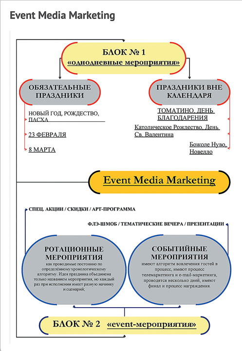 Как видно из рисунка, ивент-программа разнесена на два блока. Первый — однодневные мероприятия, которые, в свою очередь, собираются в календарный план по двум критериям. Один критерий — это обязательные праздники, наличествующие в нашем календаре, и праздники, ставшие почти своими: Новый год, Рождество, Пасха, 23 феврали, 8 марта и, к примеру, день Святого Валентина. Другой критерий собирает тематику мероприятий по праздникам вне нашего календаря, но рестораторы эти дни обязательно отмечают в своей работе, чтобы привлечь гостей новыми промоушен-поводами. Примерами для акций могут быть национальные праздники других государств — американский день Благодарения, католическое Рождество, испанский праздник томатов, день ананаса, Божоле Нуво и так далее. Поверьте, уже по этим дням набирается внушительное количество работы, особенно если увлечённо изучить, какие есть поводы и праздники, чтобы повеселиться.