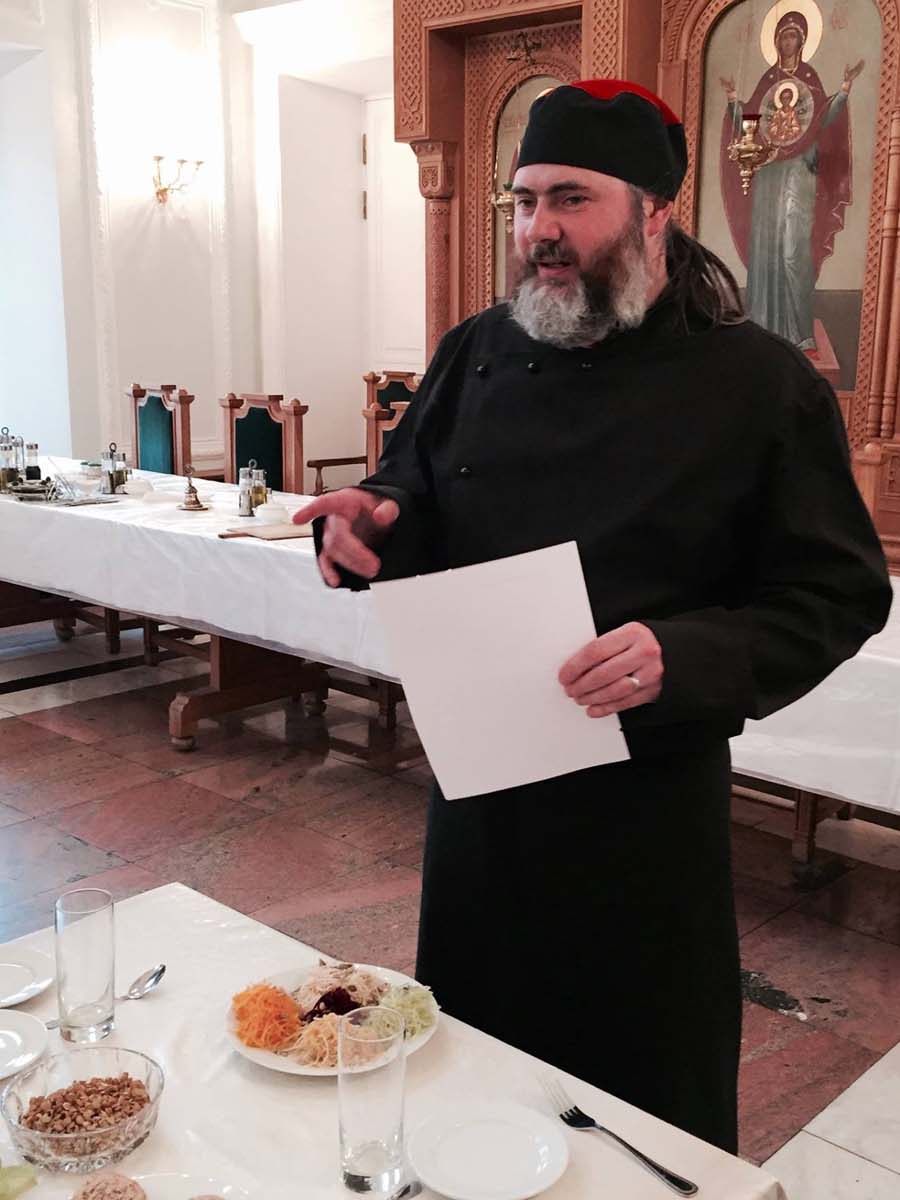 — Ресторанная и Монастырская кухни безусловно отличаются, но и у них есть точки соприкосновения. Недаром меня позвали работать в монастырь шеф-поваром: в монастыре бывают приёмы иностранных архииерев и делегаций, требуется организация банкетов высокого уровня. Дважды мне довелось организовывать патриаршие приёмы в Грановитой палате Московского кремля, так как наместник нашего монастыря служил со Святейшим Патриархом Кириллом в Успенском соборе Московского кремля, и, по традиции, он должен был организовать угощение. Отличие в том, что мы кормим бесплатно в монастыре около 500 человек в день, мы не нацелены на получении прибыли. Бывает, что внезапно приходится организовывать обед для паломников или для внезапных гостей, когда нет в наличии необходимых продуктов. Приходится что-то придумывать и готовить «кашу из топора». Ну и, конечно, меню, оно жёстко привязано к Уставу, к годовому и недельному кругу постов.