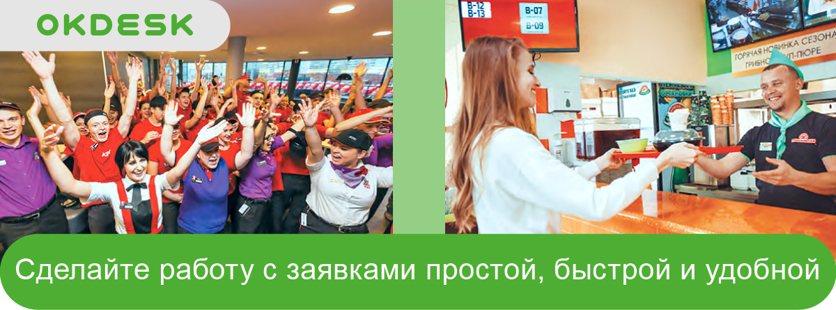 Help desk система Okdesk позволяет решать проблемы компаний любого уровня, включая таких гигантов общепита, как «Вкусно и Точка» и KFC, выводя техническое обслуживание на еще более высокий уровень и сокращая нецелевое использование ресурсов. Скорость внедрения, интуитивно понятный интерфейс, возможность гибкой настройки и подключение модулей – все это делает продукт незаменимым для автоматизации процессов.