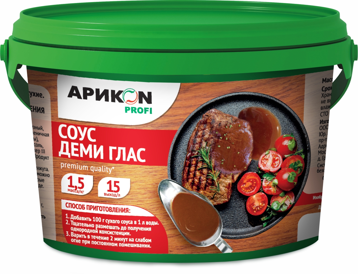 Изначально этот соус является изобретением французских кулинаров. Его используют как отдельно, так и как основу для приготовления соусов к мясным блюдам, добавляя к нему сливки, грибы, овощи, зелень, специи, вино. Классический Деми Глас готовится в течение 30 часов, однако с помощью смеси от АРИКОN PROFI его можно приготовить за пять минут. Соус не содержит глутамата натрия и консервантов, а его насыщенный вкус и аромат максимально приближен к оригинальному рецепту. Для приготовления необходимо добавить 100 грамм сухого соуса в 1 литр воды, после чего тщательно размешать до получения однородной консистенции и варить в течение двух минут .