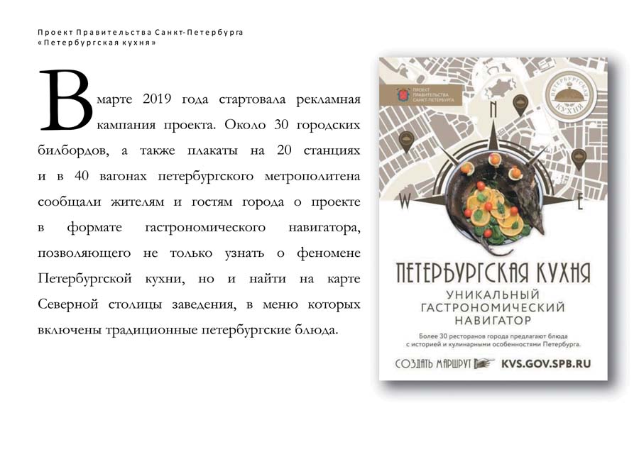 — Этот проект нацелен на возрождение гастрономических традиций Санкт-Петербурга и продвижение города как культурной, туристической и кулинарной столицы России. По данным одного из популярных интернет-порталов, 80% туристов, выбирая направление своего путешествия — другой страны или города, — обязательно смотрят на наличие там уникальной локальной кухни. А мы, говоря о Петербурге как одном из красивейших городов мира, долгое время вообще не говорили о его интереснейшей кухне.