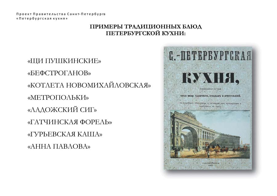 И третье — хотелось бы, чтобы особенность нашей петербургской кухни понималась и органами государственной власти, и средствами массовой информации, и жителям Петербурга, и рестораторами. Мне, например, как жителю города обидно, что на Невском проспекте из множества заведений располагаются, может быть, только два заведения даже не петербургской кухни, а просто русской. А ведь наша кухня должна стать нашей гордостью: нам есть чем гордиться.