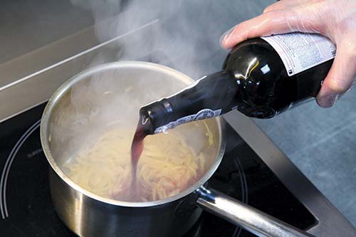 Порезать лук соломкой, обжарить до золотого цвета в масле и добавить чеснок, перец чили, пару ложек портвейна, малиновый уксус, соль, сахар и перец.