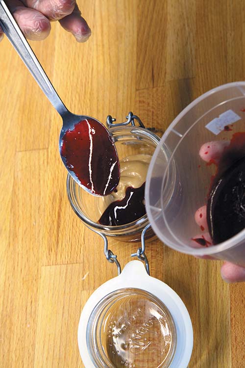 Выложить луковый мусс в форму равномерным слоем. Сверху, вторым слоем, аккуратно положить смородиновое желе. Для его приготовления нужно заранее протереть ягоды черной смородины с сахаром, поставить на огонь, довести до кипения, также пропустить через блендер, добавить полоску желатина и оставить остывать до комнатной температуры.