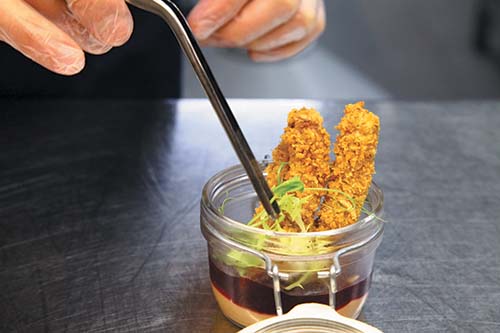Оба слоя должны застыть в холодильнике. При подаче «пальчики» должны быть теплыми, а муссы – охлажденными. Украсить молодым салатом фризе, кресс-салатом, ростками гороха.