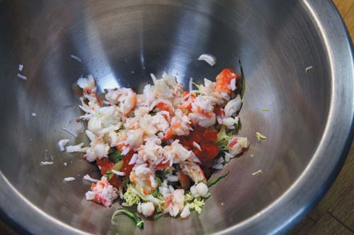 Очистить томаты от кожи и порезать маленькими кубиками по 0,5 см. Огурец и китайскую капусту нарезать мелкой соломкой, добавить камчатского краба.