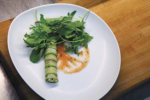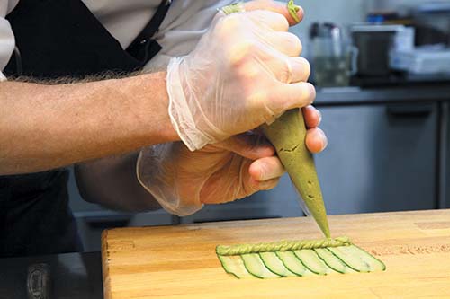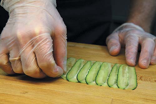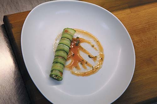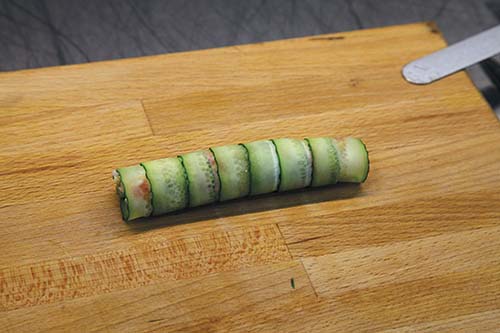 Часть огурцов нарезать слайсами и выложить плотным веером. На веер из огурцов выложить две полоски мусса из авокадо. Для приготовления мусса необходимо заранее перетереть авокадо с несколькими каплями лимонного сока.