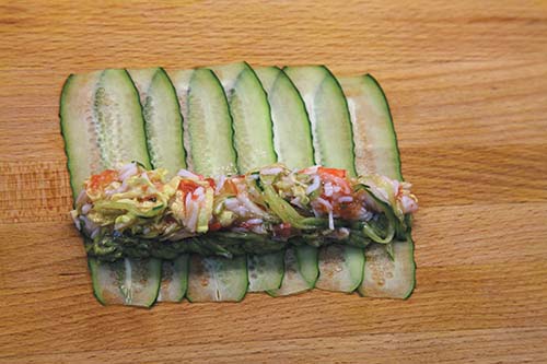 Добавить на веер из огурцов салат, замешанный ранее. Все аккуратно завернуть в ролл.