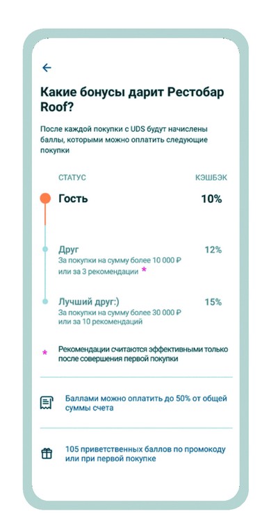 В основе программы лояльности должны быть не бонусы и скидки. В этом, кстати, заблуждаются большинство бизнесов, считая, что программа лояльности – это история про бонусы. Ведь если вы спросите самих себя или своих гостей “Почему вы ходите в наш ресторан”, то вы, вероятнее, ни разу не услышите ответ “потому что у меня есть бонусы”. Главным фактором повторного посещения ресторана является качество сервиса и блюд, положительный клиентский опыт. Поэтому, программа лояльности должна, в первую очередь, давать понимание, все ли гостю понравилось и готов ли он вернуться к вам повторно.