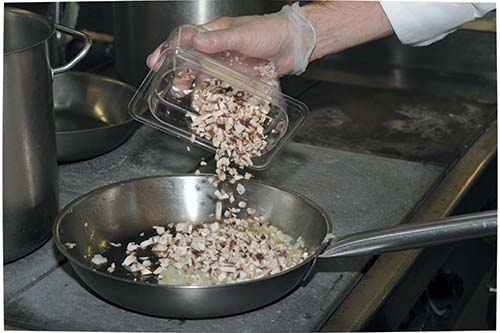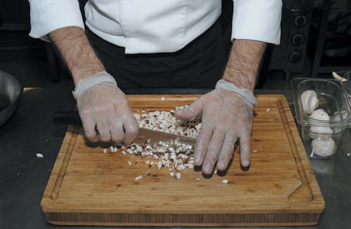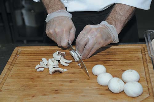 4. Нарезать мелким кубиком лук и шампиньоны.