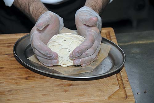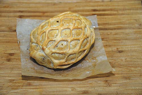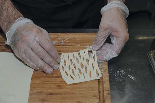 10. Из маленького кусочка теста сделать сетку и выложить на лицевую часть заготовки.