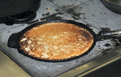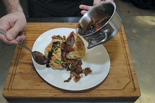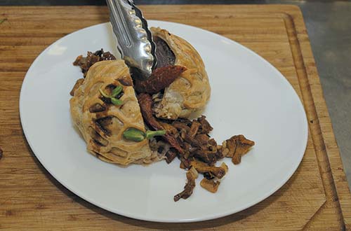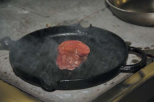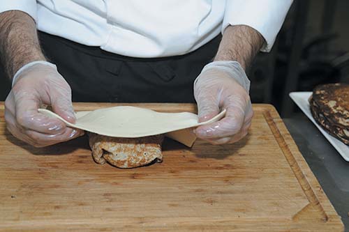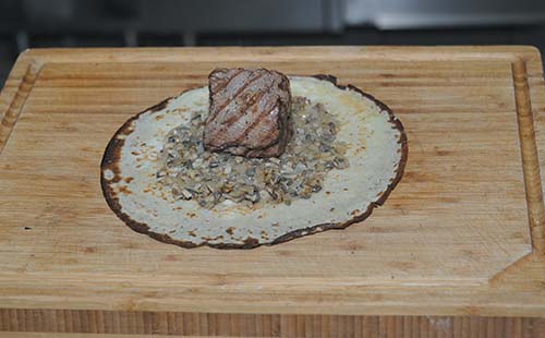 7. Положить в середину говяжий стейк и завернуть мясо в блин конвертом.