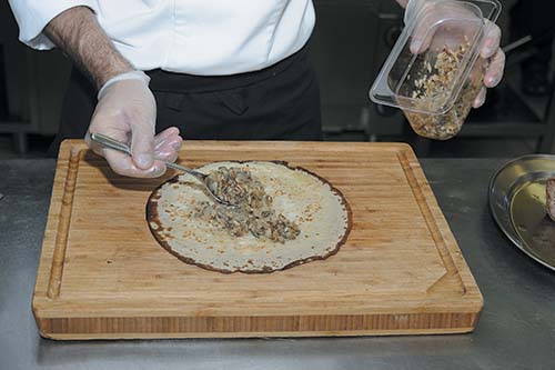 6. На тонкий пшеничный блин выложить обжаренные лук с шампиньонами и распределить по всей поверхности блина.