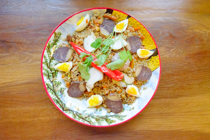 Мякоть говядины нарезаем средними кусками для того, чтобы в процессе приготовления мясо не получилось сухим. Подготавливаем остальные ингредиенты. Морковь нарезаем средним брусочком, лук нарезаем полукольцами. Рис тщательно промываем водой до прозрачности воды. Нут замачиваем и отвариваем до полуготовности. В казан или кастрюлю с толстым дном наливаем масло и раскаляем его до появления белого дымка. Добавляем лук и обжариваем до золотистого цвета, затем укладываем мясо и жарим до появления румяной корочки. Добавляем нут и морковь,тщательно все перемешивая, обжариваем в течении 5-10 мин. Добавляем специи (соль, перец, зиру) и наливаем кипятка так, чтобы вода накрывала мясо на 2 см. Закрыть казан крышкой и тушить 30-40 минут, пока мясо не станет мягким, а сам зирвак не насытиться ароматами специй. Затем все хорошо перемешиваем, засыпаем рис, покрывая равномерно всю поверхность, заливаем на 2 см больше от поверхности риса. Вставляем головки чеснока. Убавляем огонь и накрываем крышкой. Томим в течении 30 минут, после того, как влага испарилась, делаем проколы скалкой или любой ложкой. Накрываем крышкой, делаем огонь минимум и еще томим 15-25 мин. Для более интересной подачи плов хорошо перемешивают, укладываю на большую тарелку, украшают яйцами, можно добавить зелень и кусочки казы (колбаса вареная из конины), чесноком пропаренным, который готовился вместе с пловом. Так же можно посыпать семенами граната.