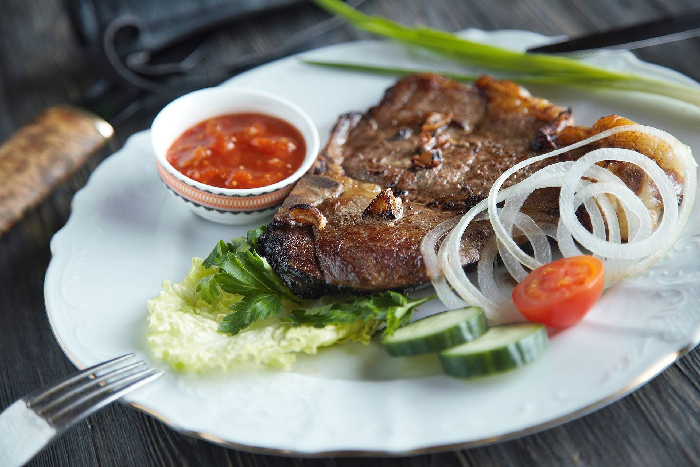 Подавать стейк из оленины рекомендуем с крупно-резаным салатом из свежих овощей, или ягодным соусом.